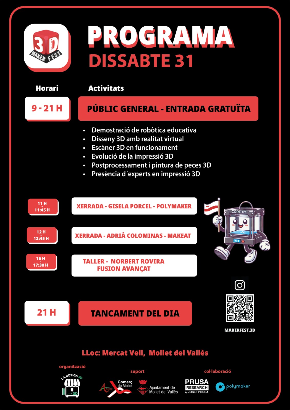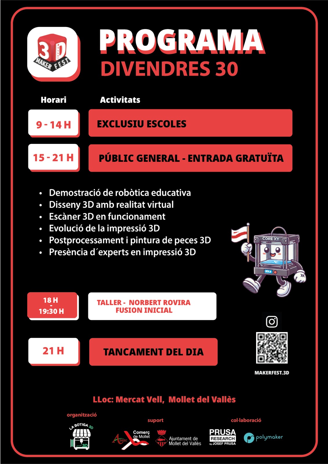 En 9 días llega la Maker Fest 3D al Mercat Vell de Mollet del Vallès. Dos jornadas gratuitas para descubrir la impresión 3D en vivo, charlas y talleres, proyectos especiales y mucha comunidad. En este artículo tienes el resumen completo del evento: programa del viernes 30, programa del sábado 31, charlas, talleres y el avance del proyecto estrella: la Fuente de Mollet impresa en 3D.