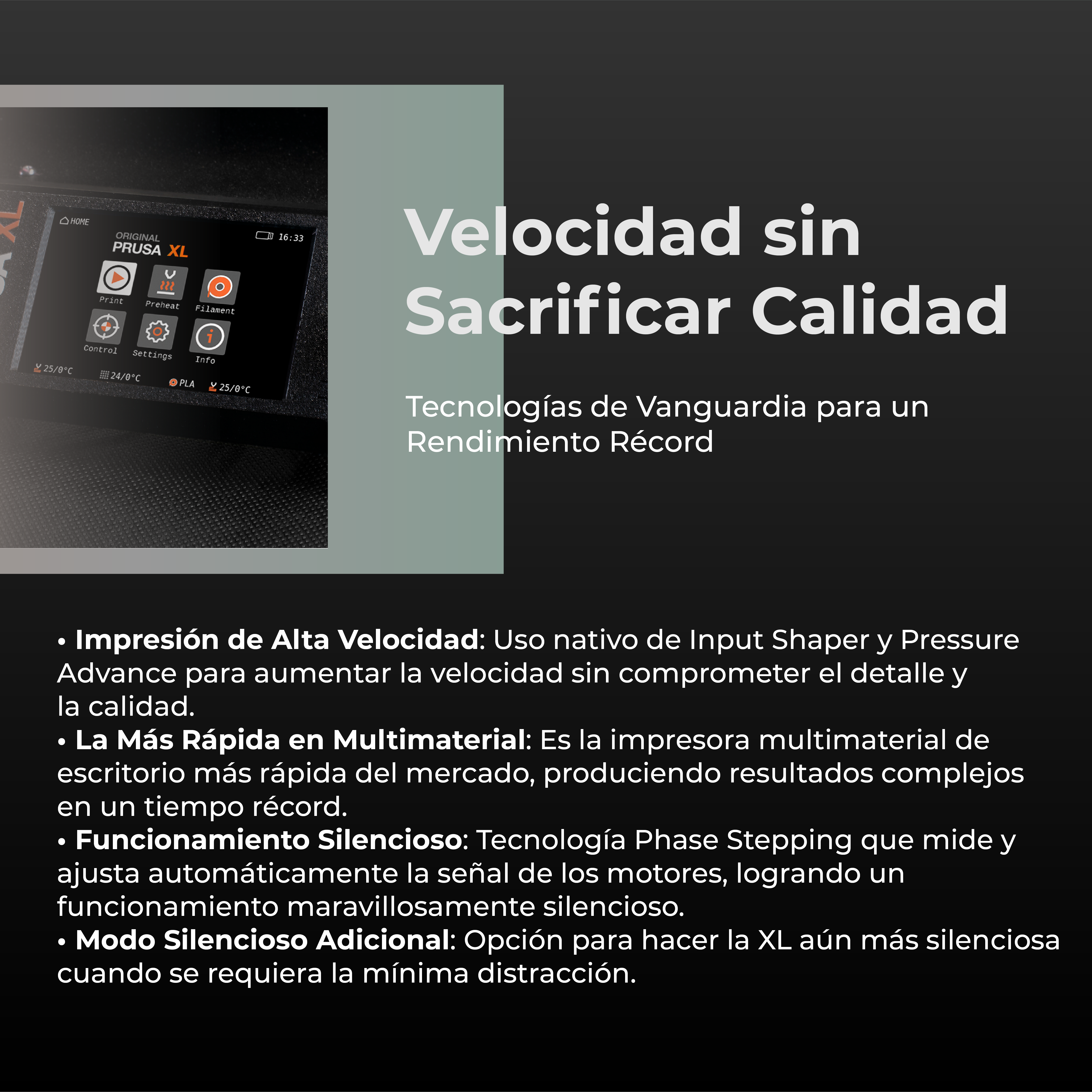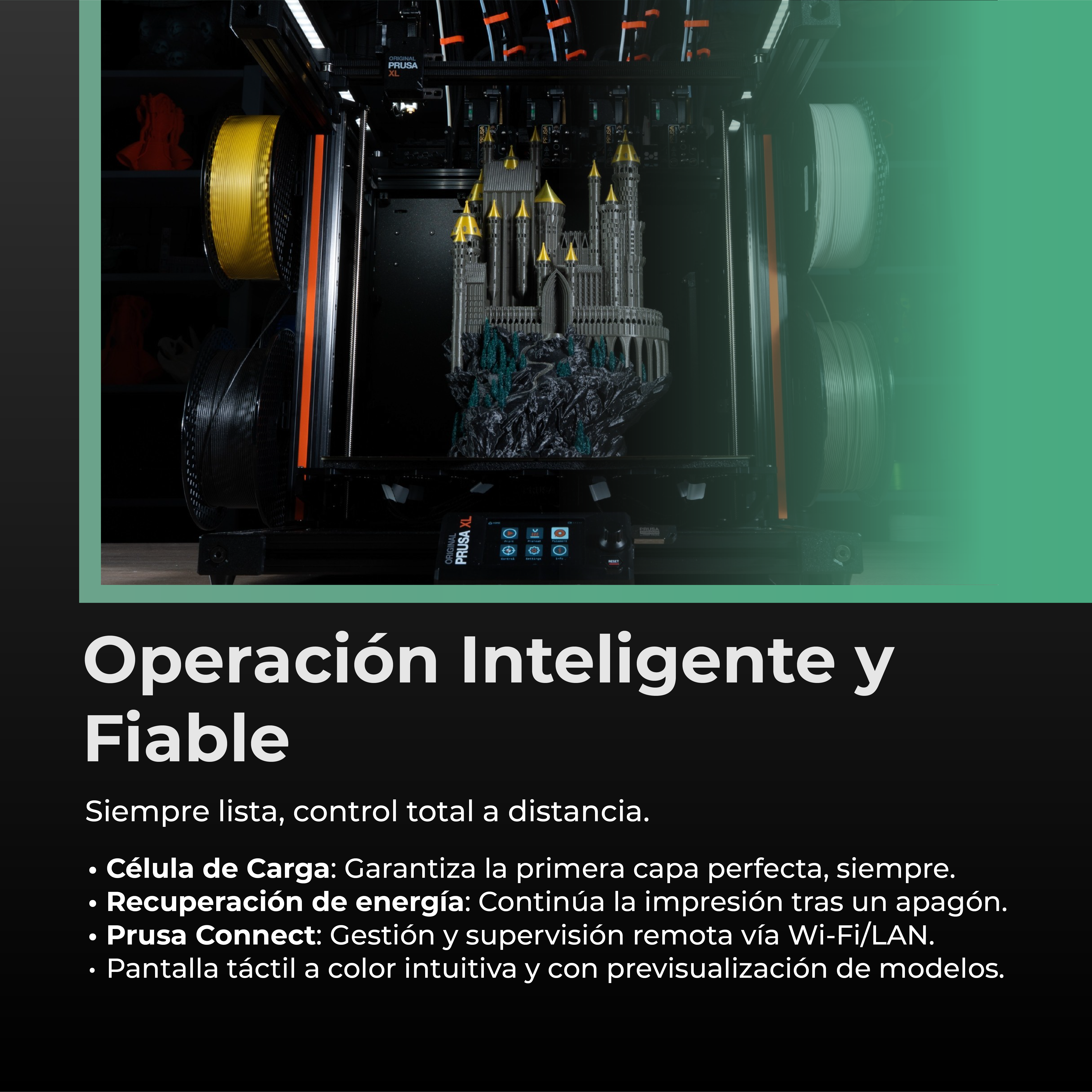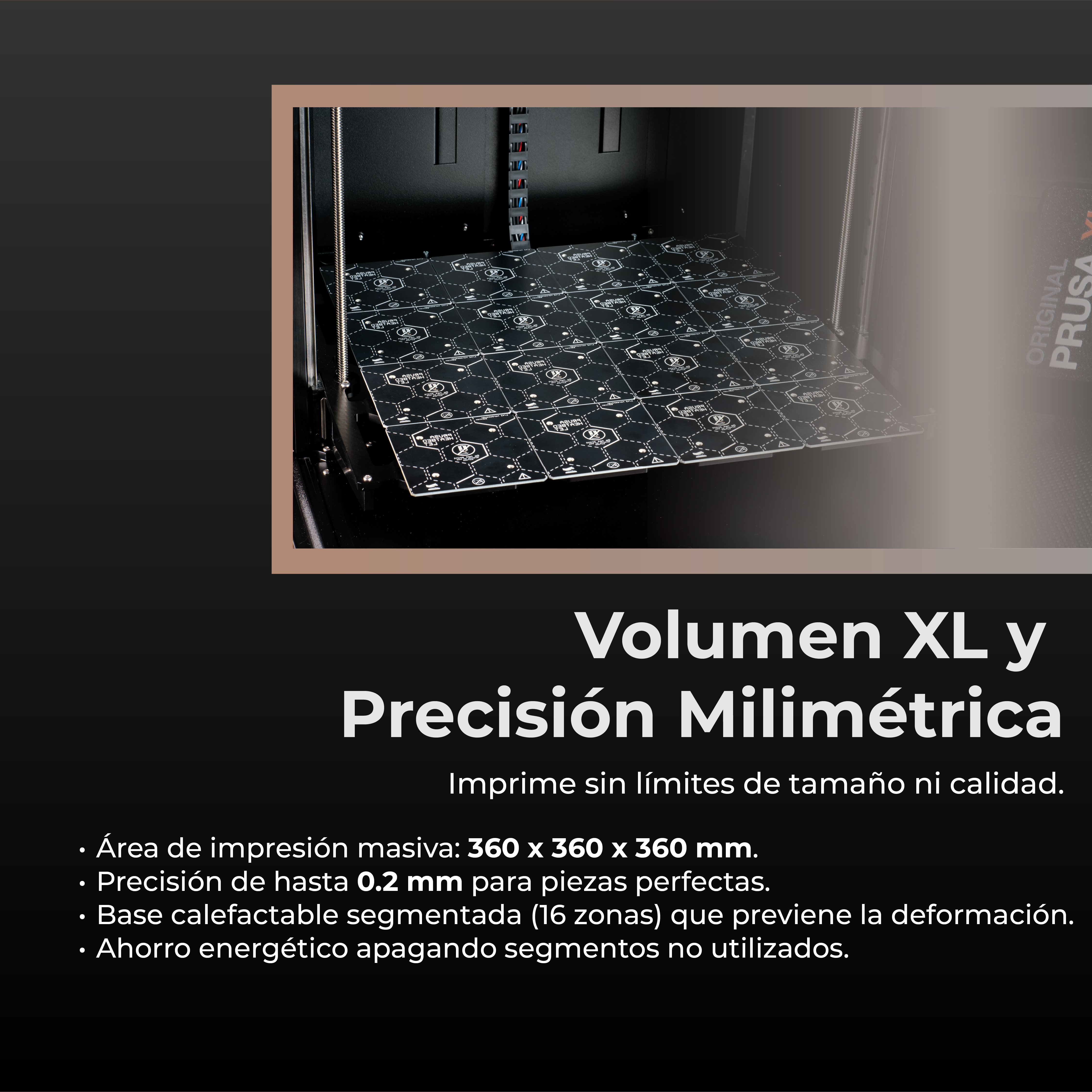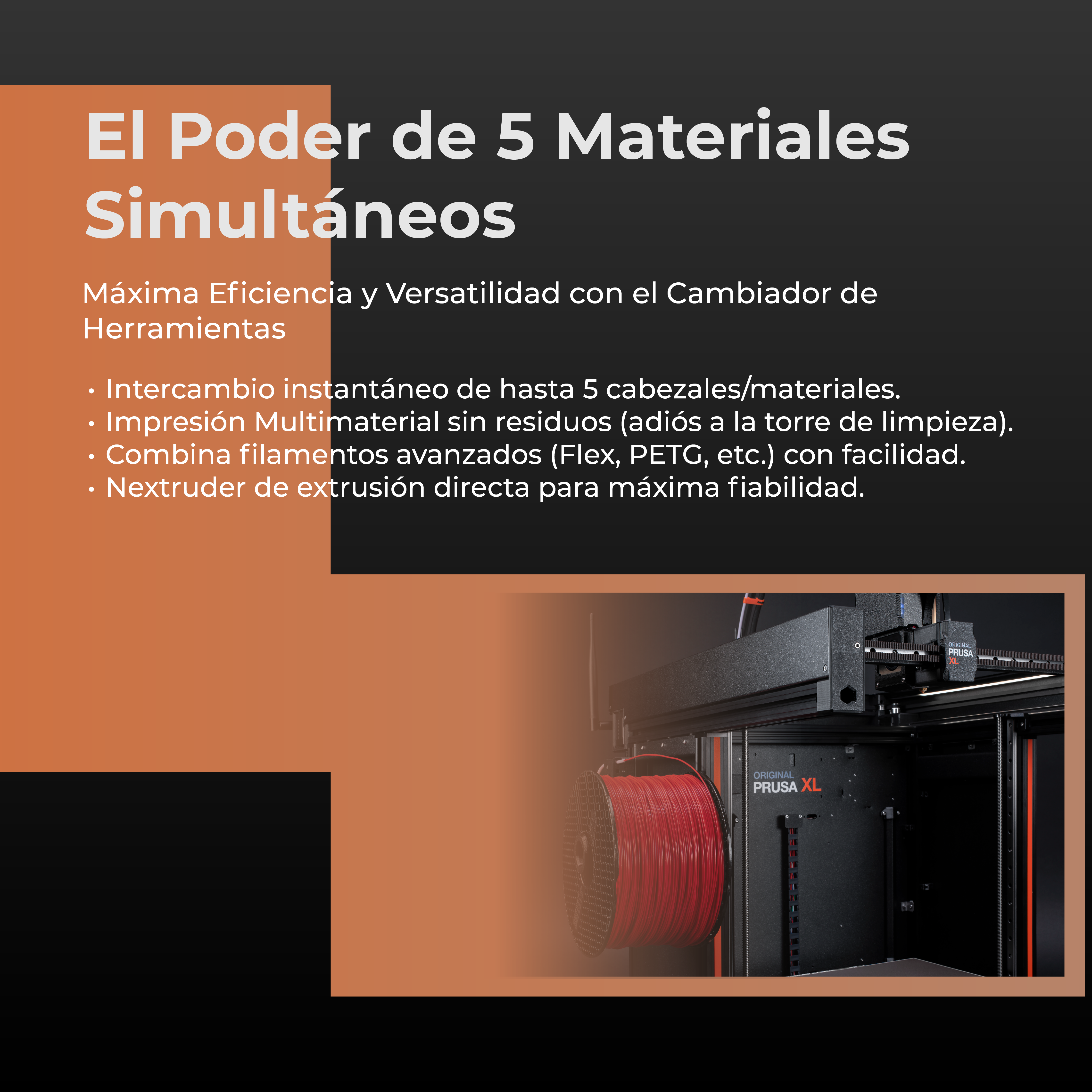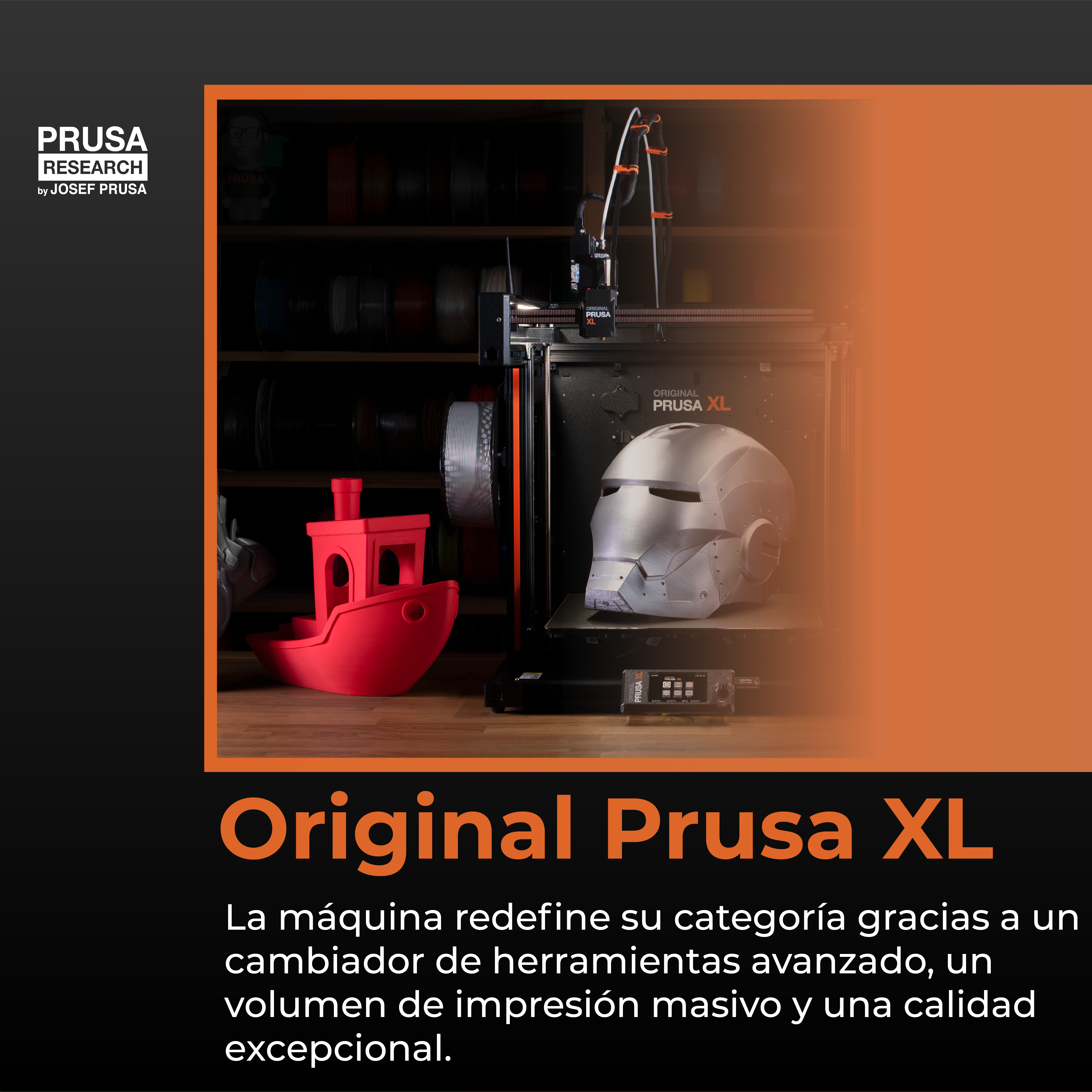 La Original Prusa XL es una impresora 3D de gran formato que incorpora un sistema CoreXY y un innovador cambiador de herramientas de hasta cinco cabezales, ofreciendo una combinación excepcional de volumen de impresión, precisión y versatilidad. Diseñada para satisfacer las necesidades de profesionales y entusiastas avanzados, la Prusa XL permite realizar proyectos complejos y de gran escala con facilidad.