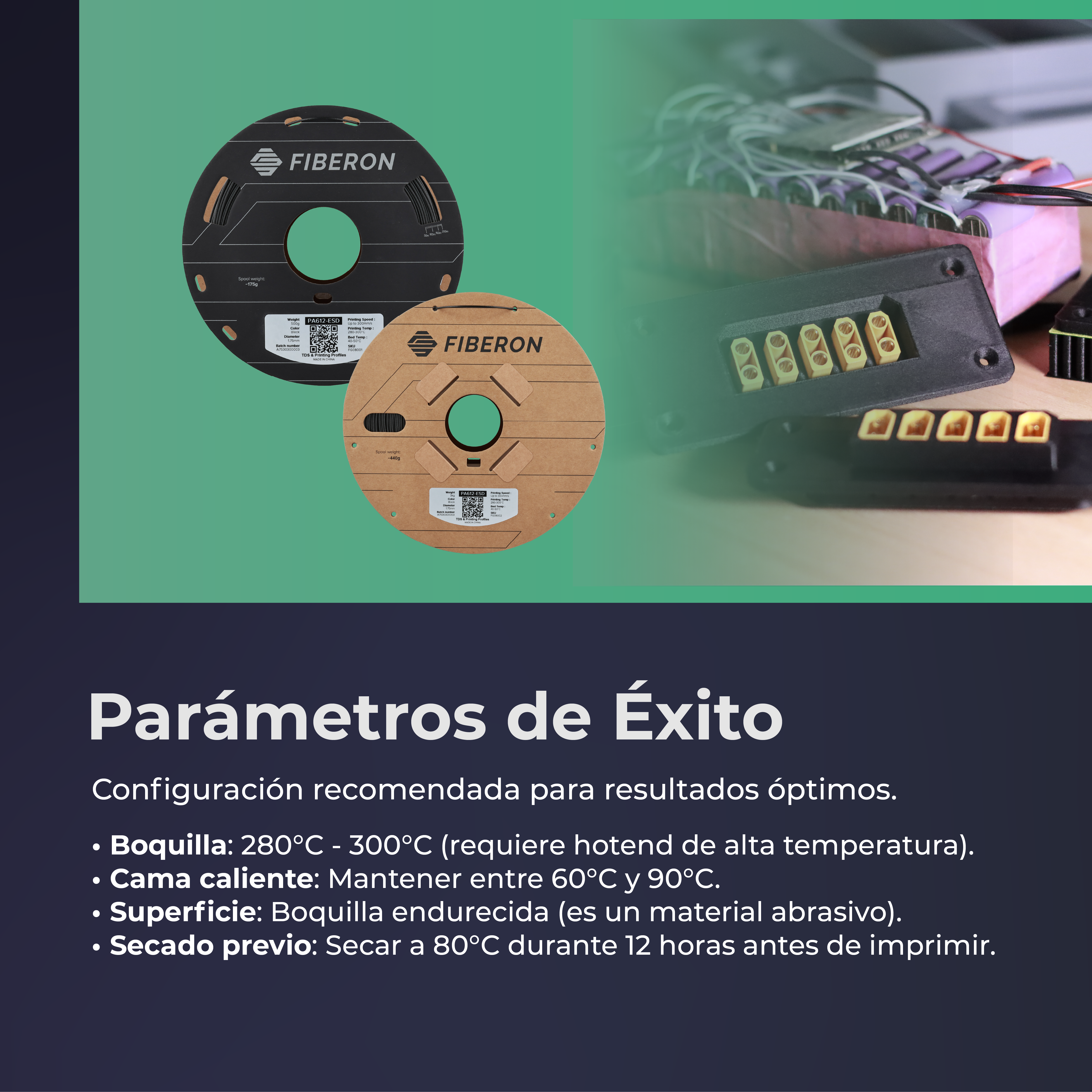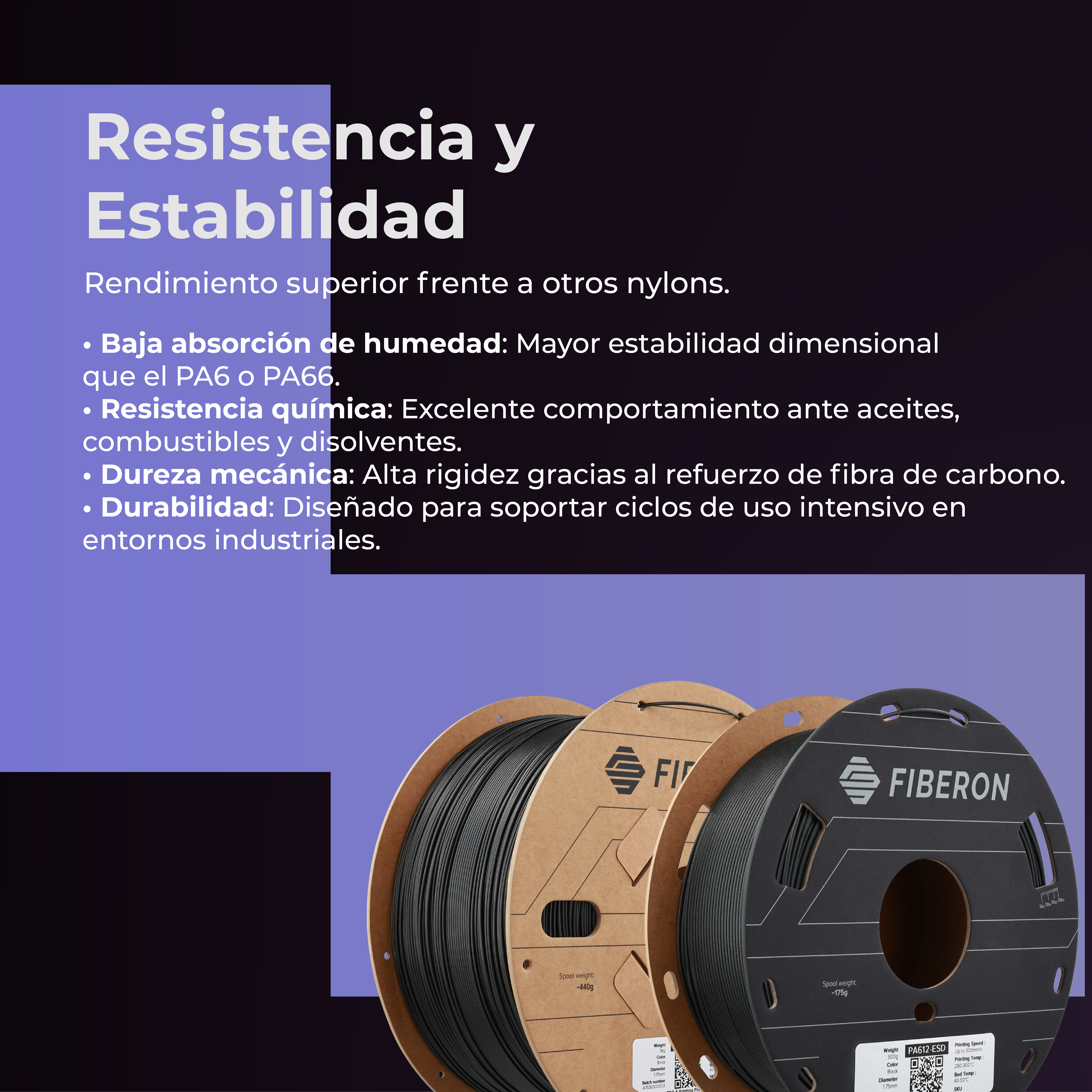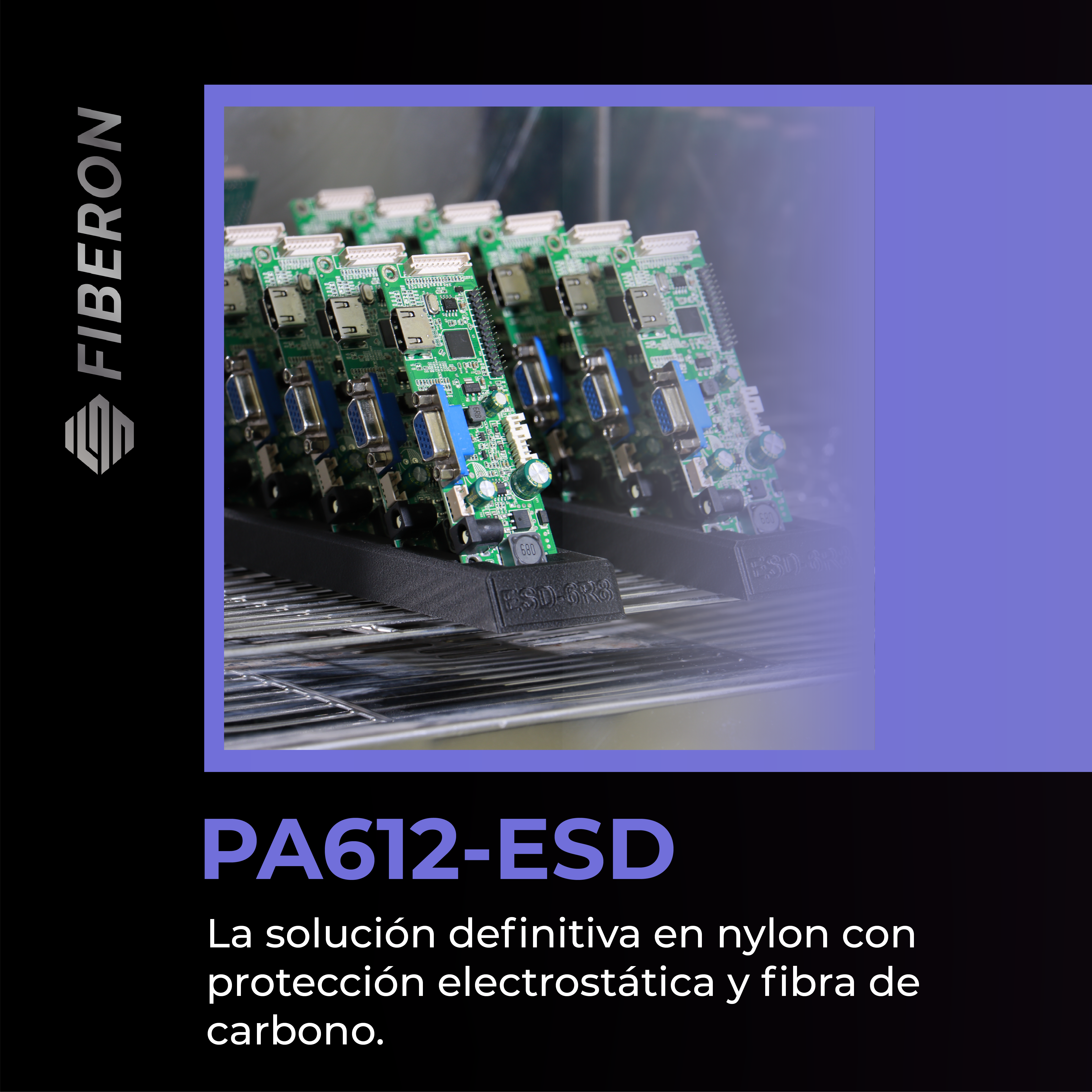 Fiberon PA612-ESD es un filamento de nailon con nanotubos y fibras de carbono, diseñado para alta durabilidad mecánica y protección ESD. Ideal para aplicaciones electrónicas, piezas industriales y plantillas y accesorios.