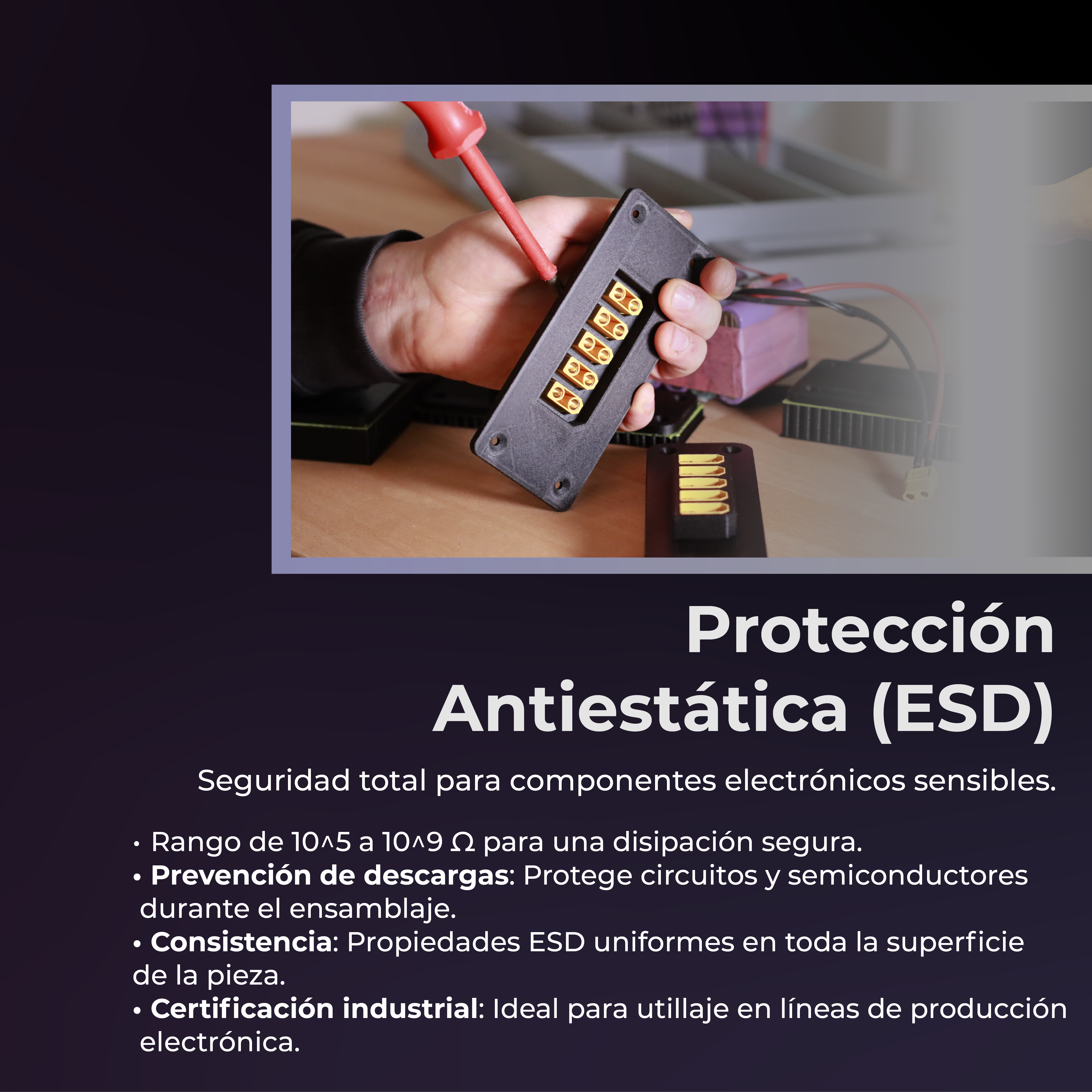 Filamento de última generación que combina resistencia mecánica, disipación electrostática y alta resistencia al calor, ideal para carcasas ESD, plantillas y fijaciones seguras. Permite imprimir piezas funcionales resistentes al calor hasta 157 °C, con propiedades fiables tanto en condiciones secas como húmedas.
