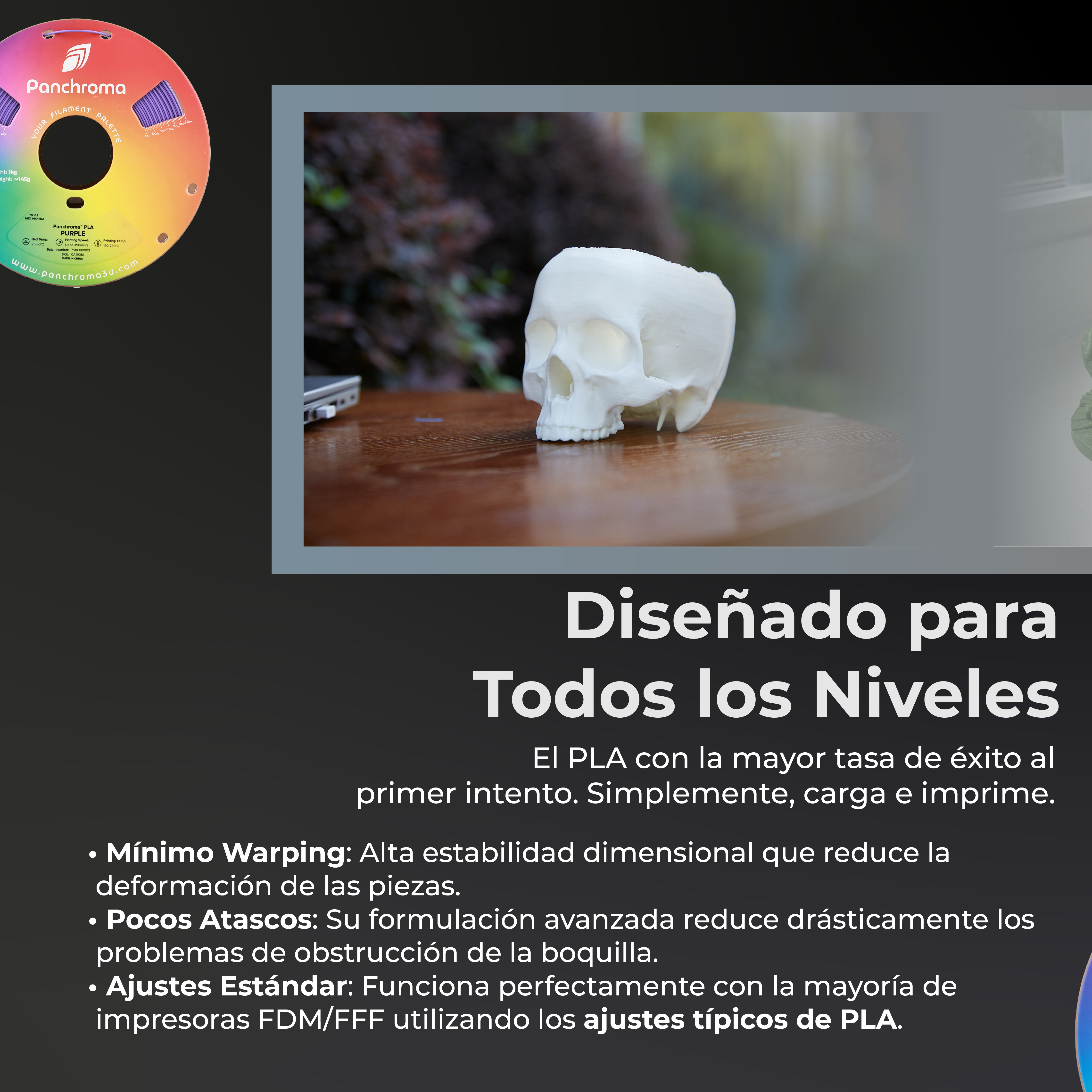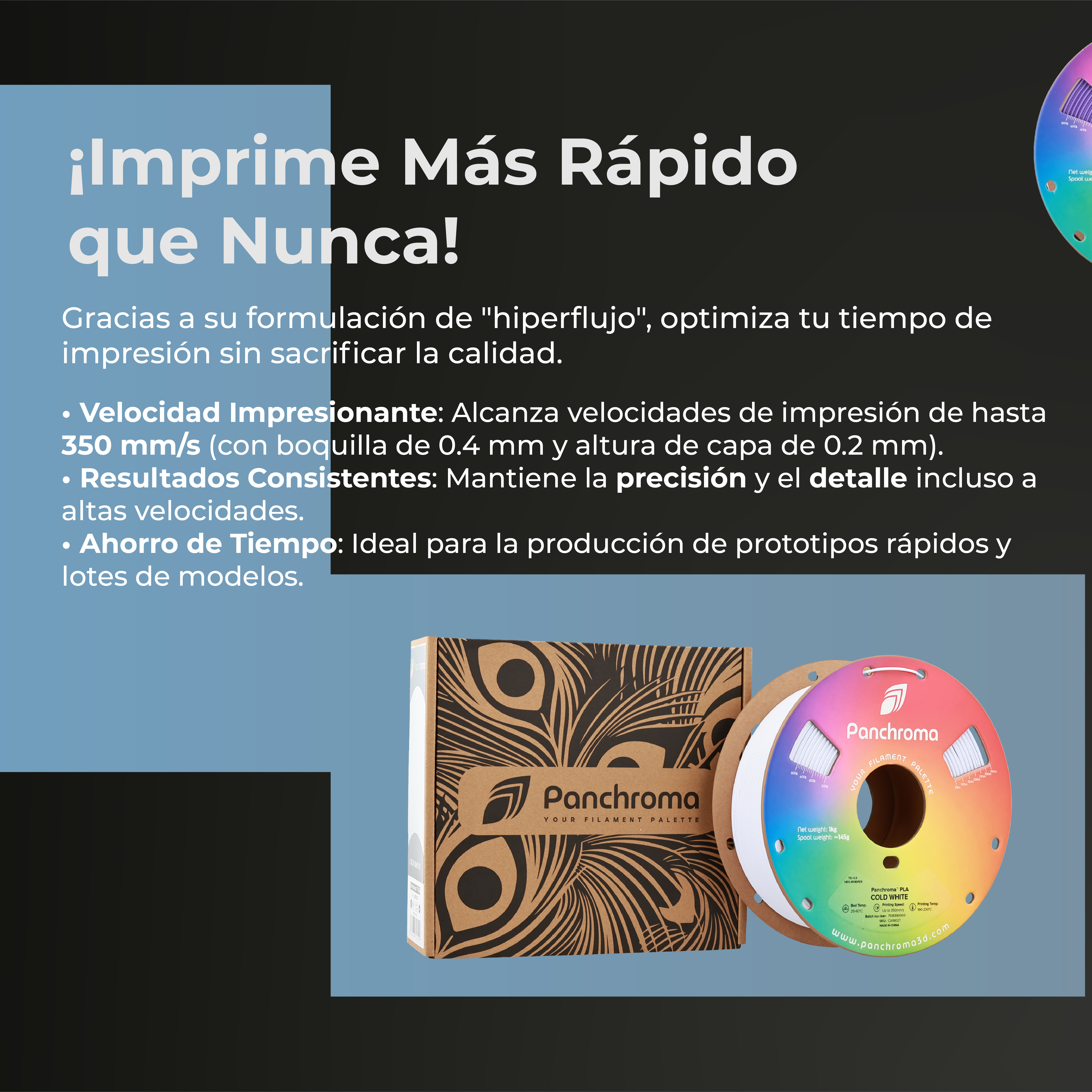 Panchroma PLA High Speed está formulado para alcanzar mayores caudales sin comprometer la calidad de detalle, garantizando superficies limpias incluso en modelos complejos. Su bobinado ordenado reduce atascos y asegura un flujo constante, ideal para impresiones largas. Con excelente adhesión a la cama y compatibilidad total con FDM/FFF, es una opción versátil para proyectos creativos, prototipos y piezas decorativas.