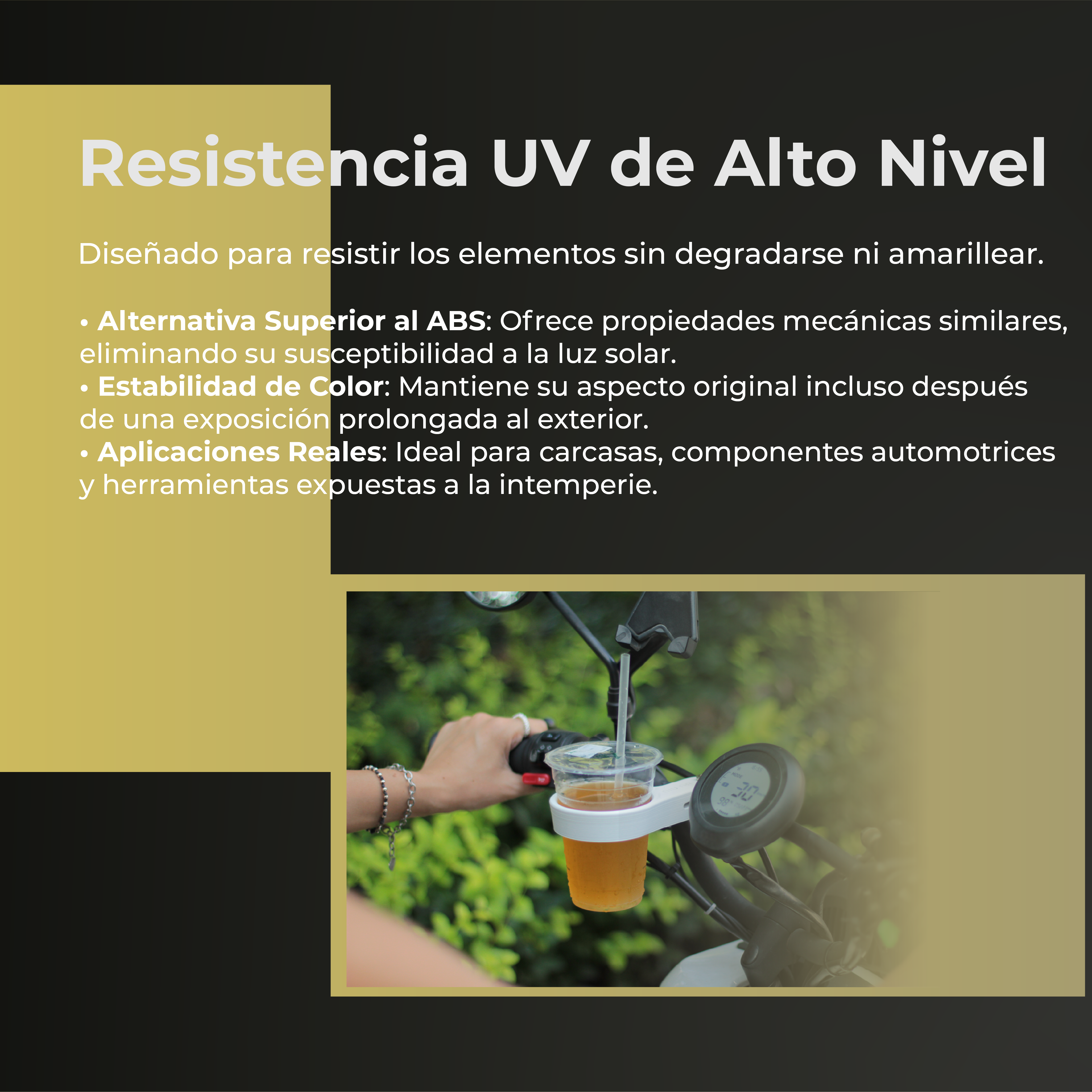 • Resistencia a la intemperie y a los rayos UV: A diferencia del ABS, el ASA ofrece una resistencia superior a la degradación causada por la exposición prolongada al sol y a condiciones climáticas adversas, preservando la integridad y el color de las piezas impresas.