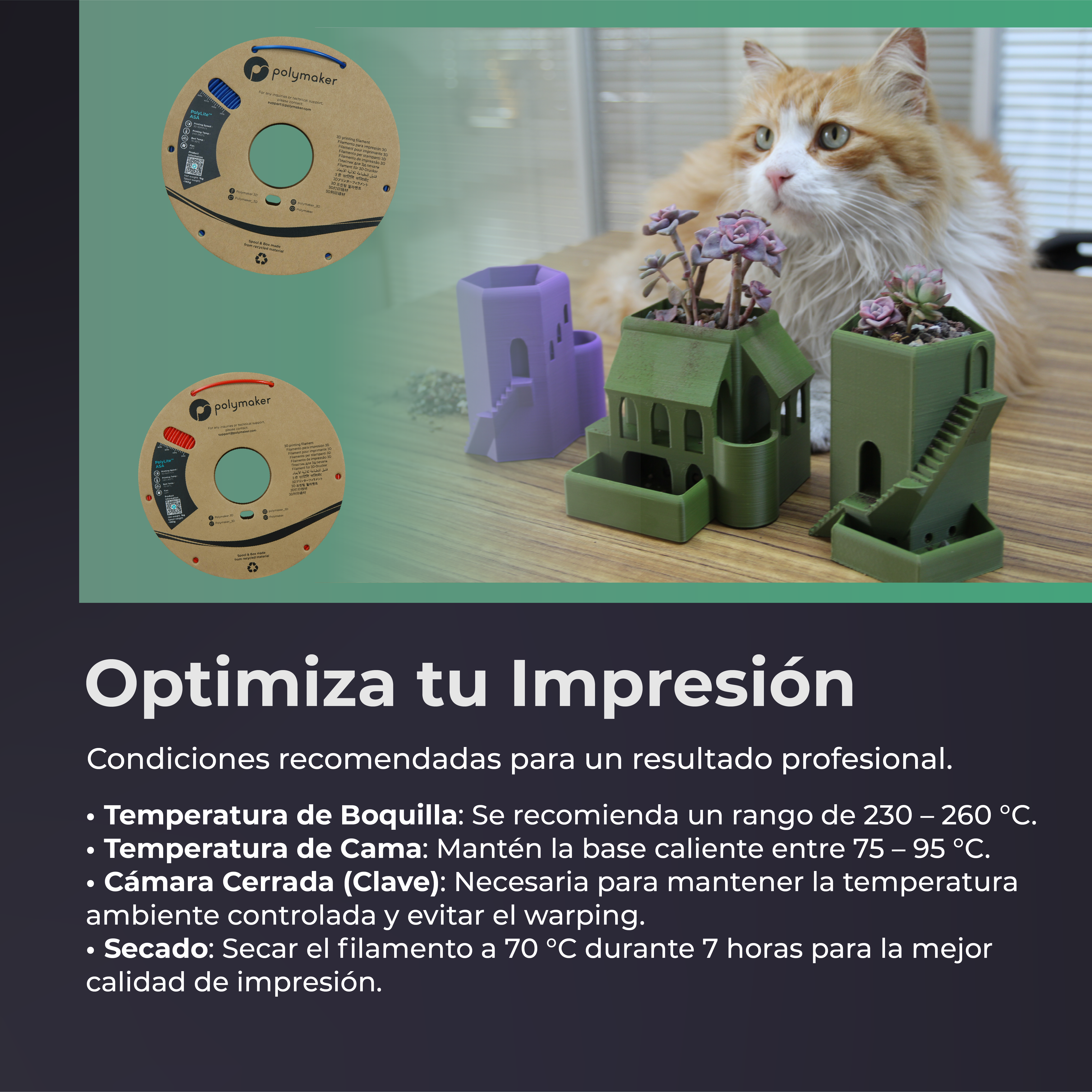 • Para minimizar el riesgo de deformaciones y mejorar la adhesión entre capas, se recomienda utilizar una impresora 3D con cámara cerrada.