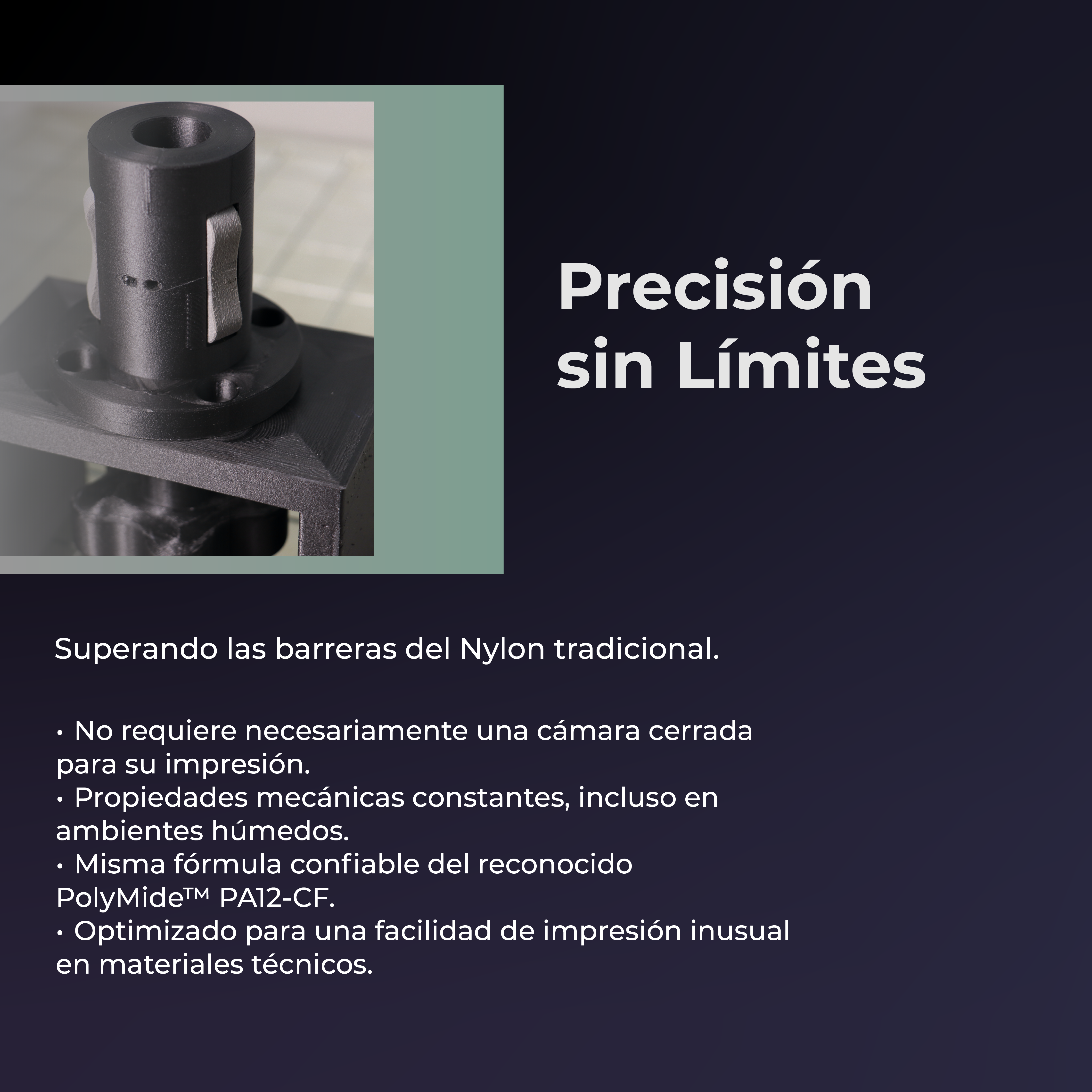 - Alta resistencia mecánica: La incorporación de un 10% de fibra de carbono proporciona una rigidez y resistencia superiores, con un módulo de Young de 3,311 MPa en condiciones secas, permitiendo la fabricación de piezas duraderas y ligeras.