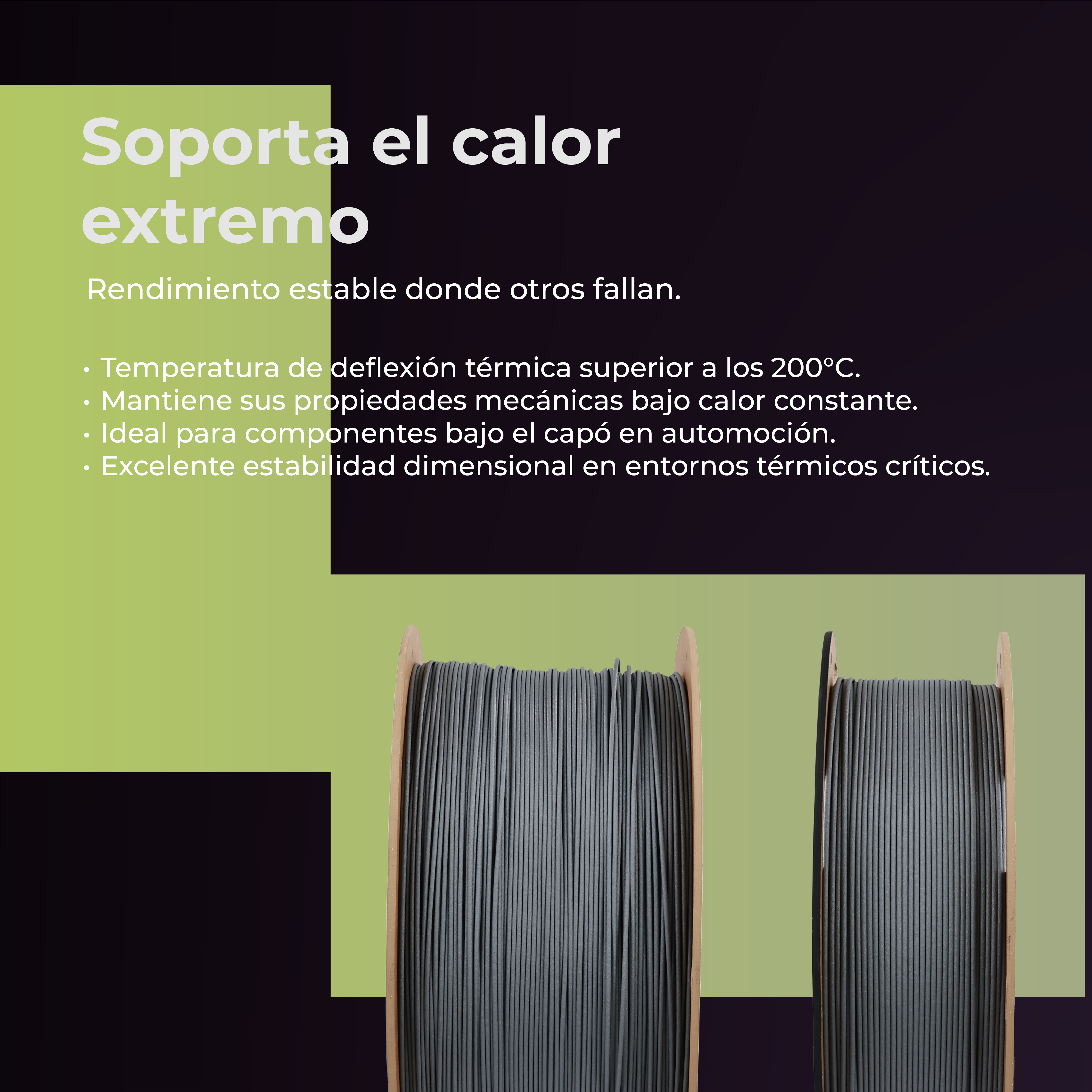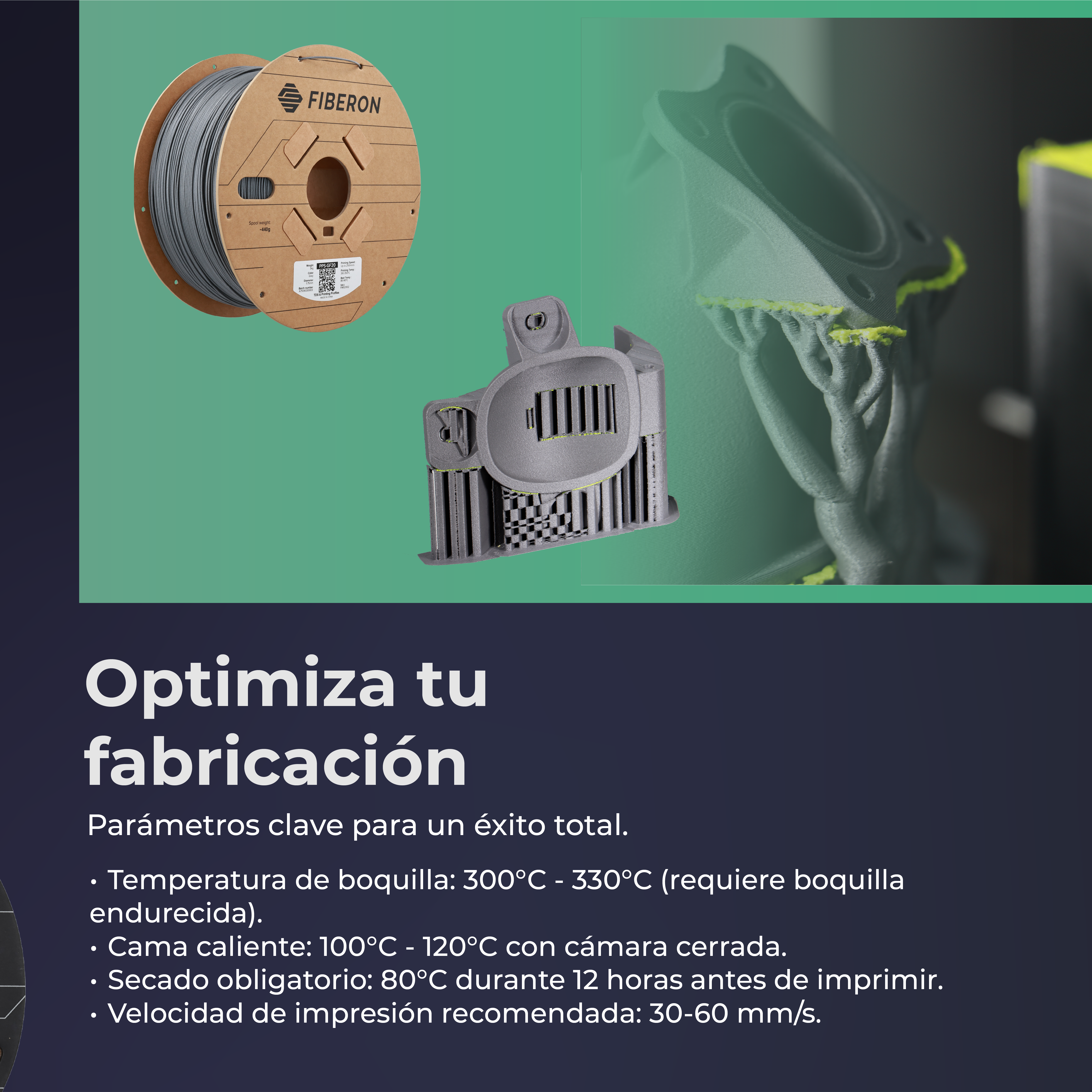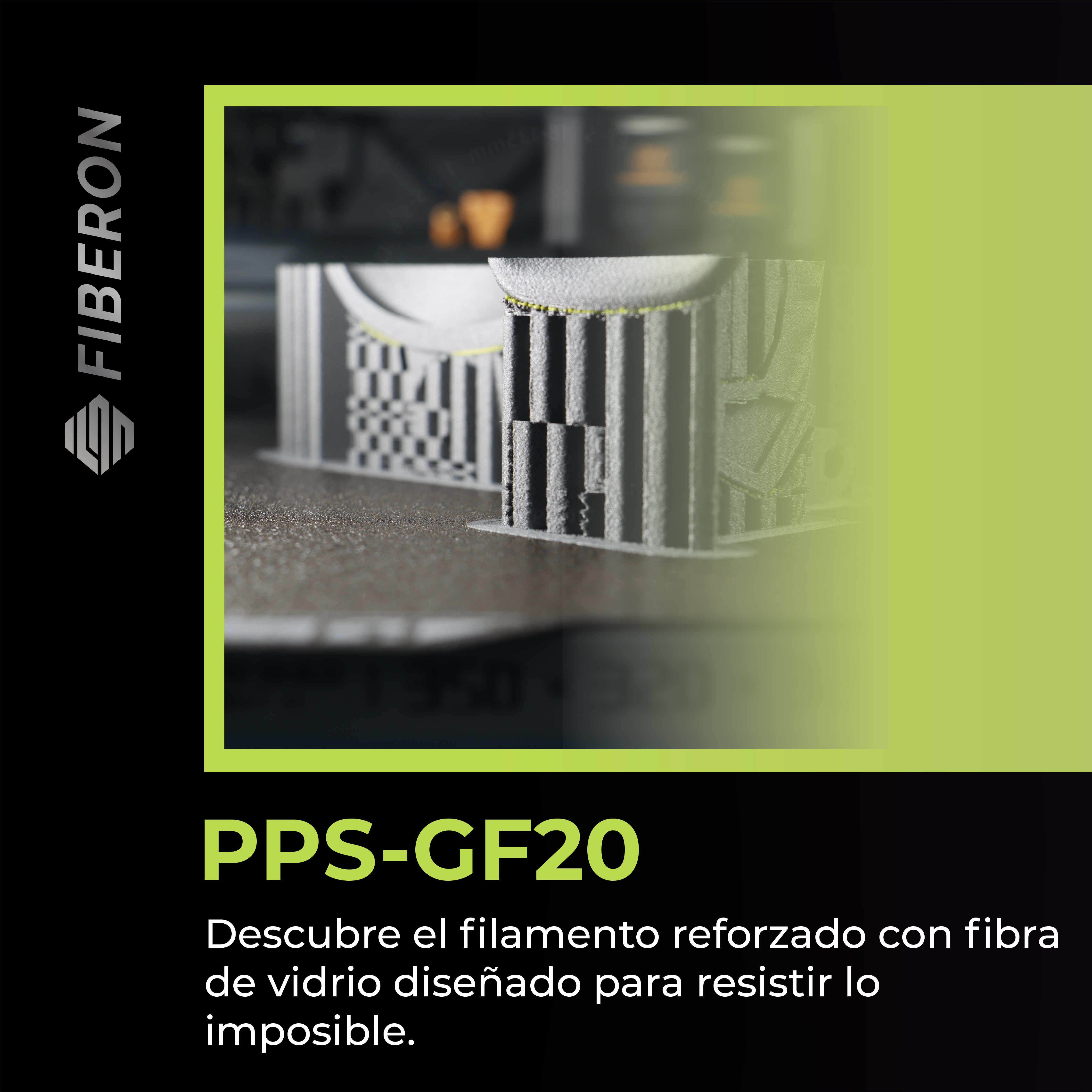 Fiberon™ PPS-GF20: filamento de polifenileno sulfuro reforzado con 20% de fibra de vidrio. Resistencia química, mecánica y térmica para aplicaciones industriales.
